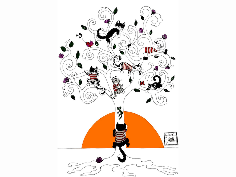 Realizzata in cotone 100 %, presenta un disegno originale stampato in alta definizione digitale, che riprende i gatti sull’albero dell’omonimo plaid della collezione.
